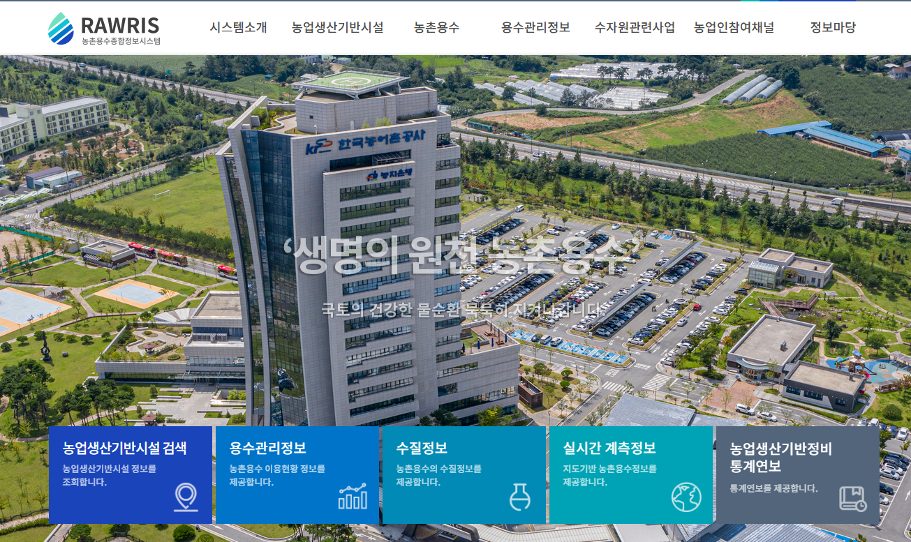 - 저수율현황, 수질정보, 급수예고 등 농업용수 전반 정보